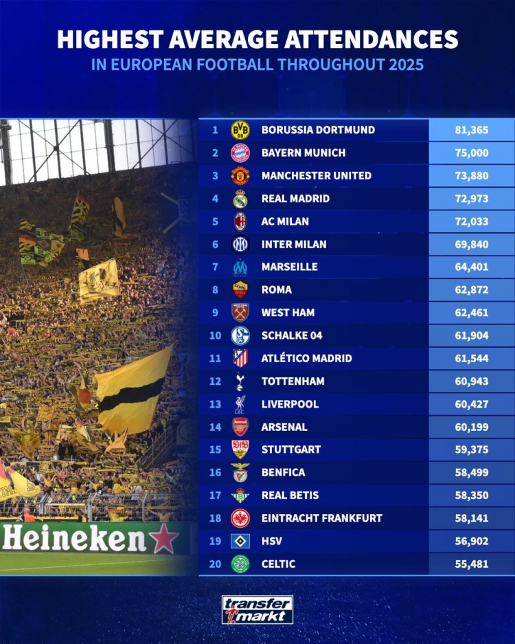 2025年欧洲俱乐部场均上座数排行:多特第1、拜仁第2、曼联第3