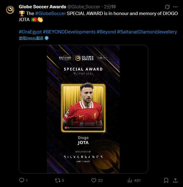 12月29日讯 2025环足奖颁奖典礼上,前利物浦前锋若塔获得特别纪念奖。
