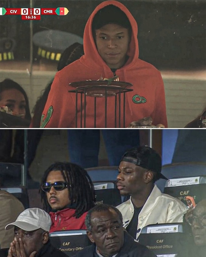12月29日讯 非洲杯小组赛的一场强强对话,F组第二轮科特迪瓦1-1战平喀麦隆。本场比赛三位法国籍球星来到了现场观战,分别是姆巴佩、琼阿梅尼和孔德。