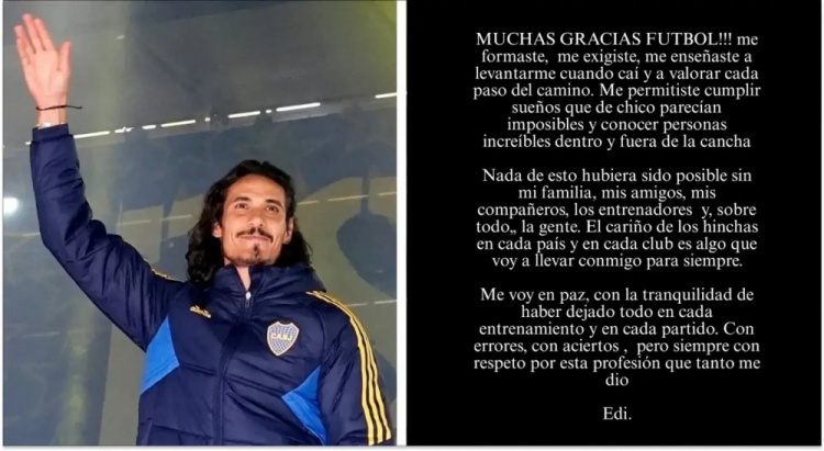 日前一篇帖子疯传,声称38岁的卡瓦尼已宣布退役,并附上了一张据称是他在Instagram上发布的告别信息的截图。