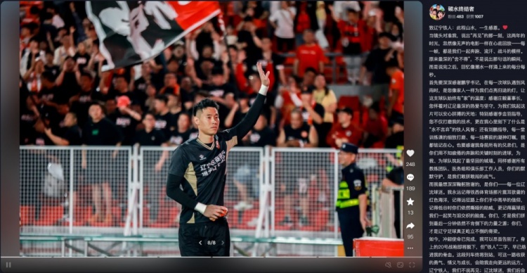 而我最想深深鞠躬致谢的,是你们——每一位辽沈球迷。我永远记得铁西体育场那片震耳欲聋的红色海洋,记得远征路上你们手中高举的信仰,记得低谷时你们依然嘶哑的助威,更记得赢球后我们一起笑与泪交织的脸庞。你们,才是我们拼到最后一分钟依然不肯倒下的力量之源;你们,才是辽宁足球真正屹立不倒的脊梁。