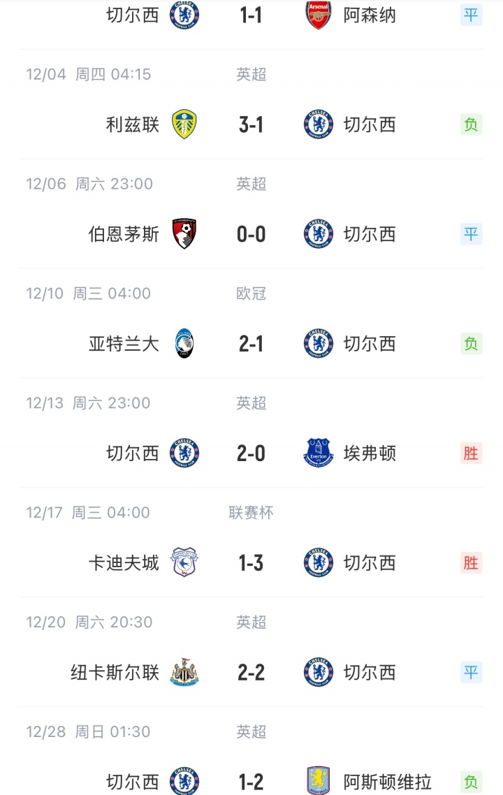 切尔西第12轮时排名第二,落后阿森纳6分,领先曼城1分。但进入12月,切尔西联赛6场1胜3平2负,排名掉至第五与曼联同分,落后利物浦3分。此外,切尔西目前落后榜首高达13分。