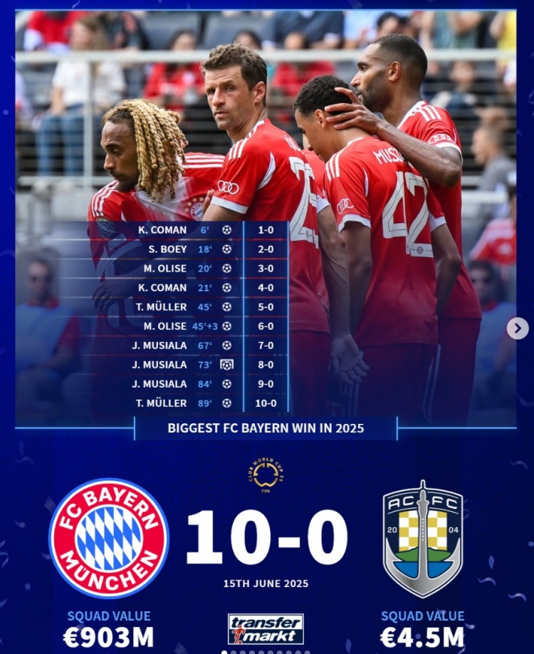 12月30日讯 2025年临近尾声,《转会市场》也列出了多家豪门在今年的最大比分胜利情况,拜仁是唯一单场进球上双的球队。