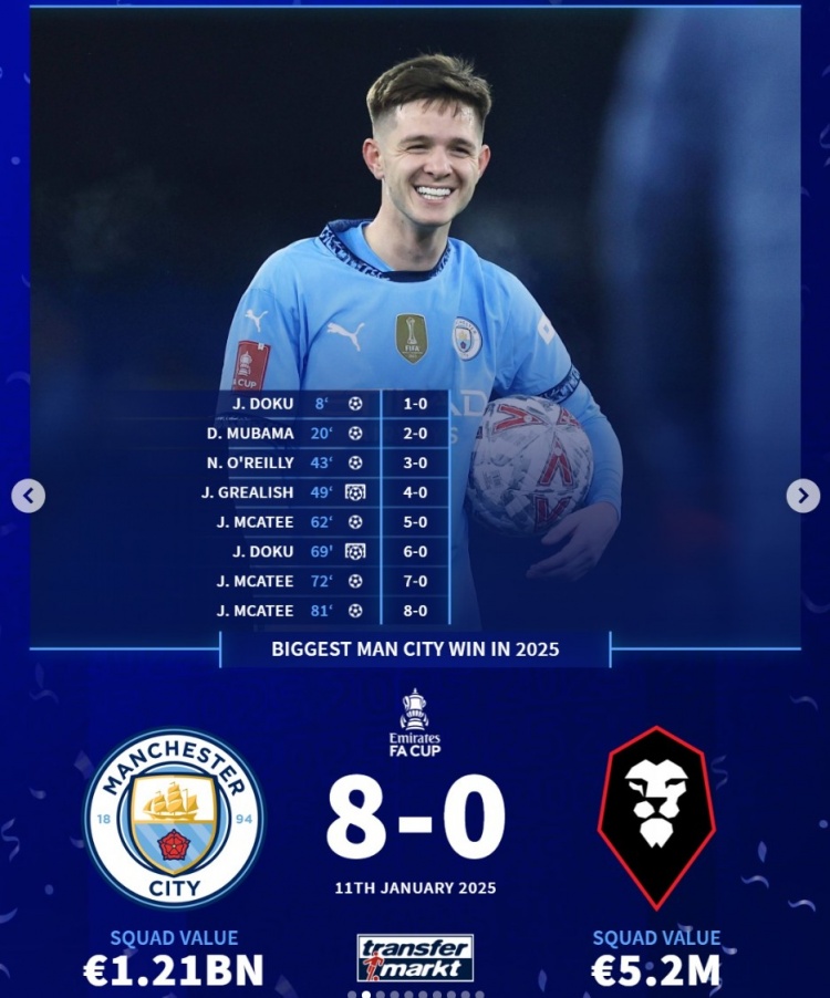 曼城:足总杯,8-0索尔福德城