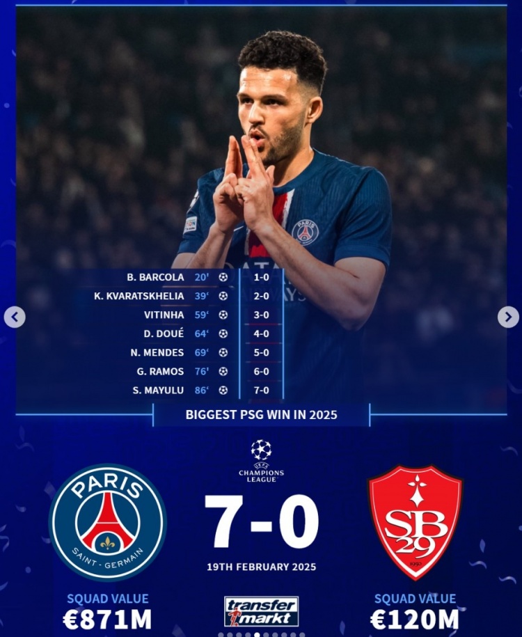 巴黎:欧冠,7-0布雷斯特
