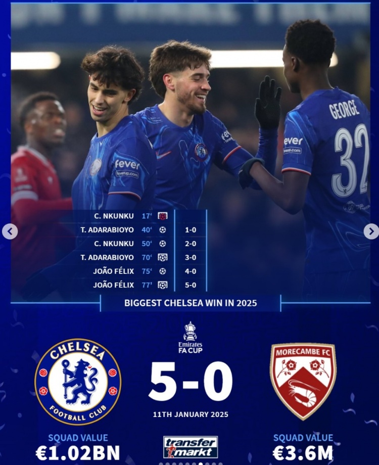 切尔西:足总杯,5-0莫克姆
