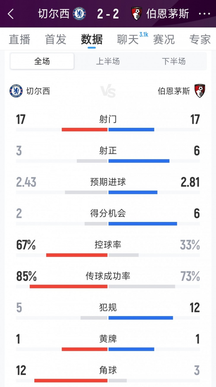 12月31日讯 在本轮英超,切尔西 2-2战平伯恩茅斯,以下为双方全场数据对比: