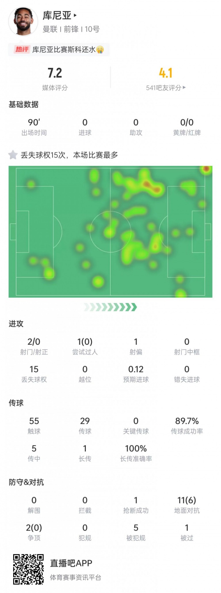 12月31日讯 英超第19轮比赛,库尼亚踢满全场,曼联主场1-1战平狼队。