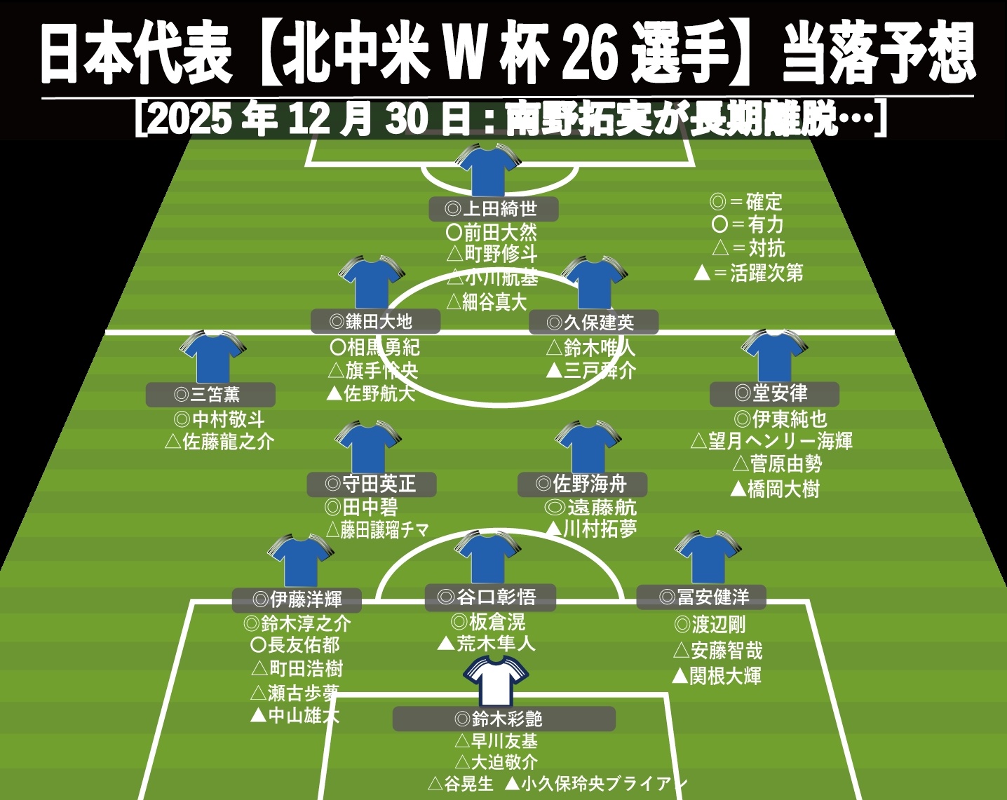 恐怖!一图看日本2026世界杯首发猜想,首发每个位置都有3人备选
