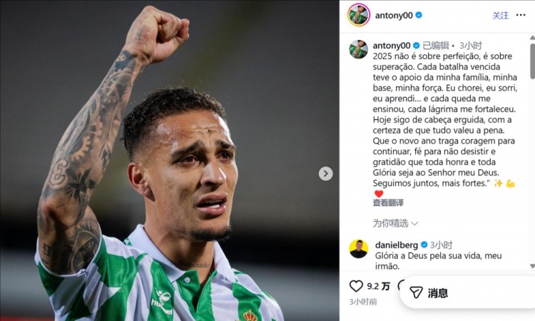 1月1日讯 2026年到来,皇家贝蒂斯前锋安东尼更新社交媒体,总结了2025年。