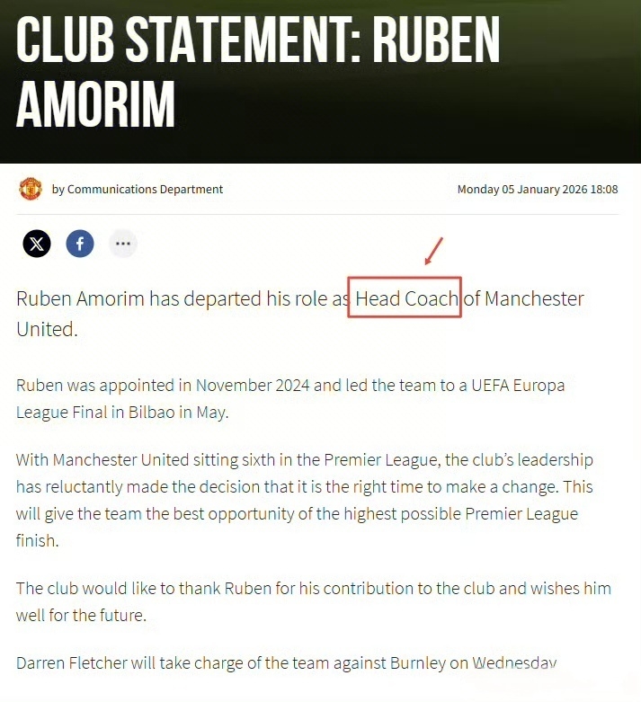 值得注意的一点是,在曼联宣布阿莫林离任的公告中,用词依旧是“Head Coach”(主教练)而不是“Manager”(经理)。就在昨晚曼联1-1战平利兹联的比赛结束后,阿莫林还在发布会上表示,自己是曼联的经理,而不是教练。
