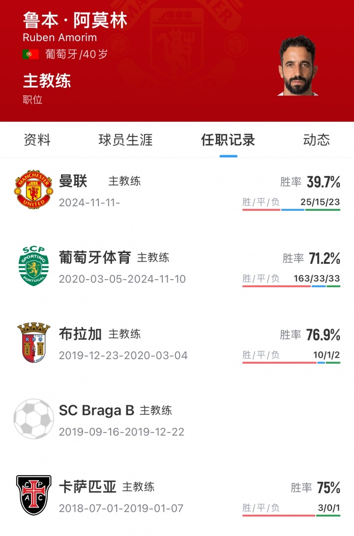 2024年11月,阿莫林出任曼联主帅,带队取得25胜15平23负,带队一年胜率不足40%。本赛季曼联目前排名英超第6。