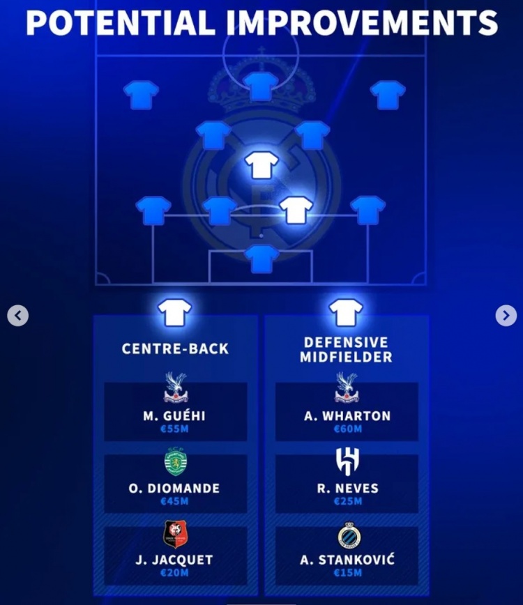 1月7日讯 冬窗已至,《转会市场》也列出了皇马的潜在补强位置、目标人选及其身价: