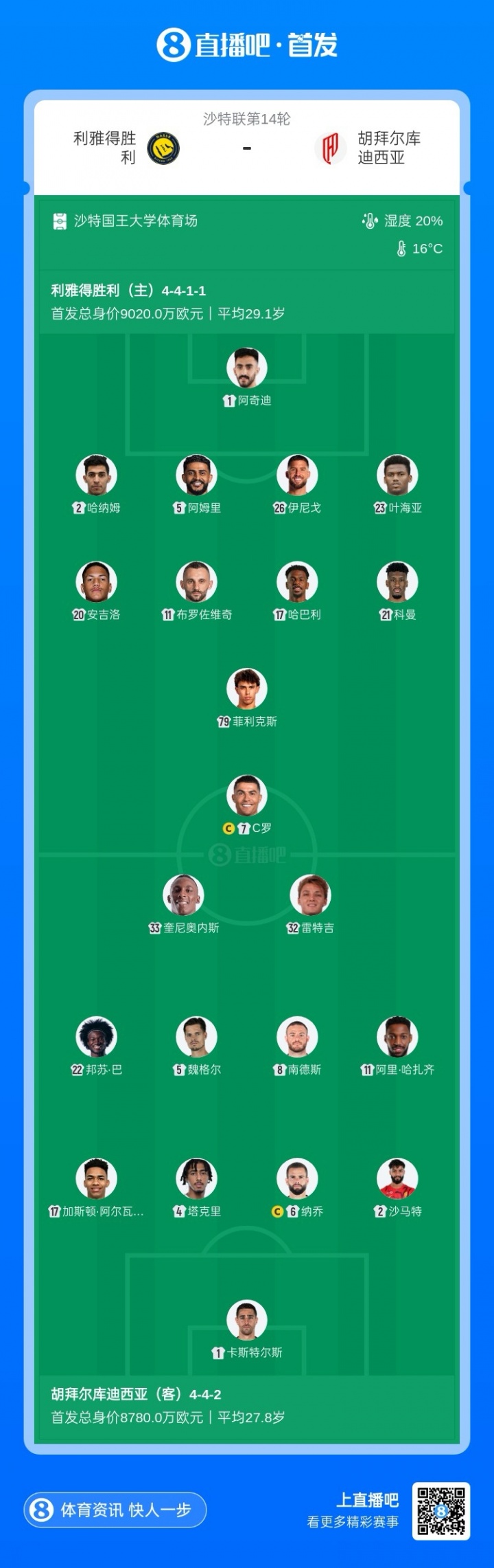 利雅得胜利首发:1-阿奇迪、2-哈纳姆、5-阿姆里、26-伊尼戈·马丁内斯、23-叶海亚、11-布罗佐维奇、20-安吉洛、17-哈巴利、21-科曼、79-菲利克斯、7-C罗