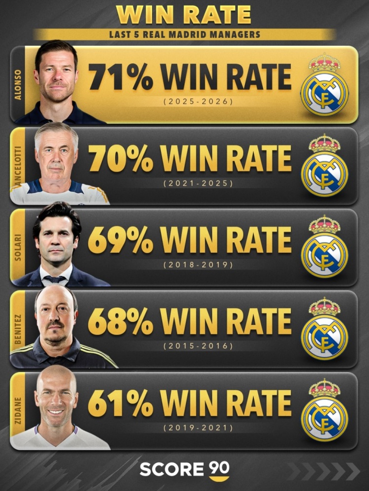 1月13日讯 皇马官宣阿隆索下课,阿隆索在白衣军团的执教生涯仅225天。据Score90数据统计,皇马近五任主教练中,阿隆索以71%的胜率排名榜首,安帅70%次之。