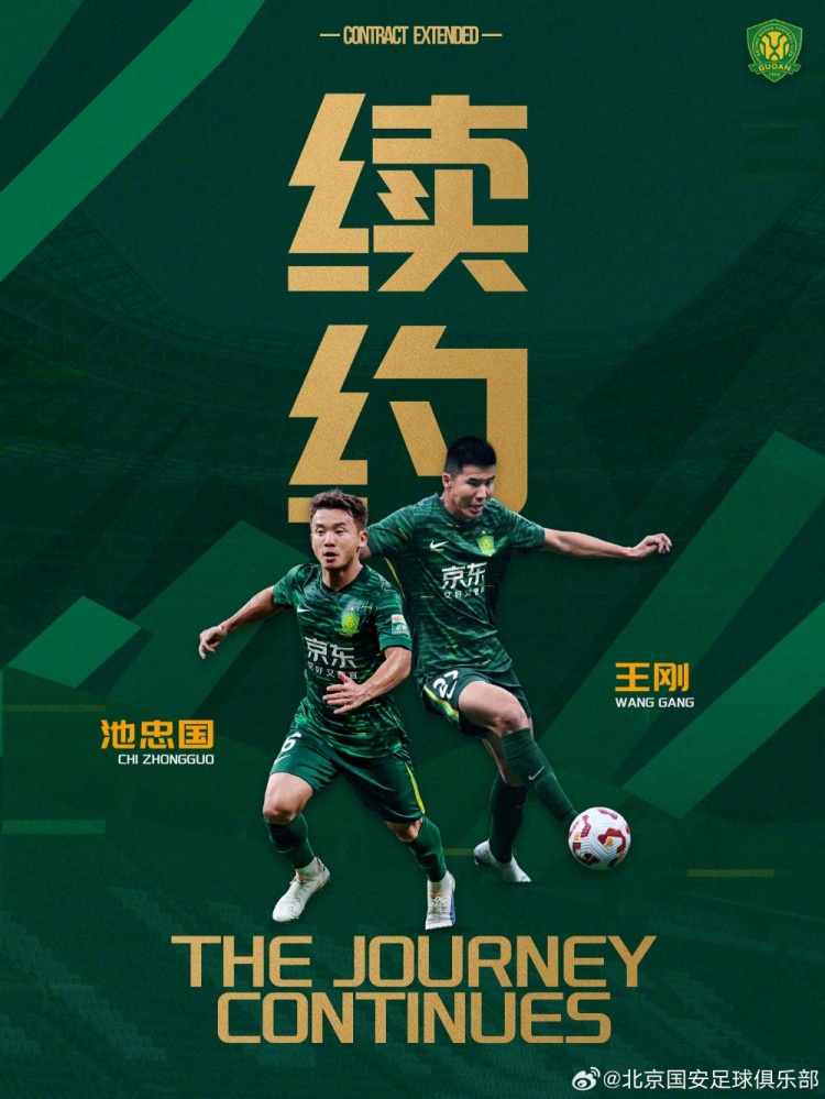 北京国安足球俱乐部近期与王刚、池忠国完成续约
