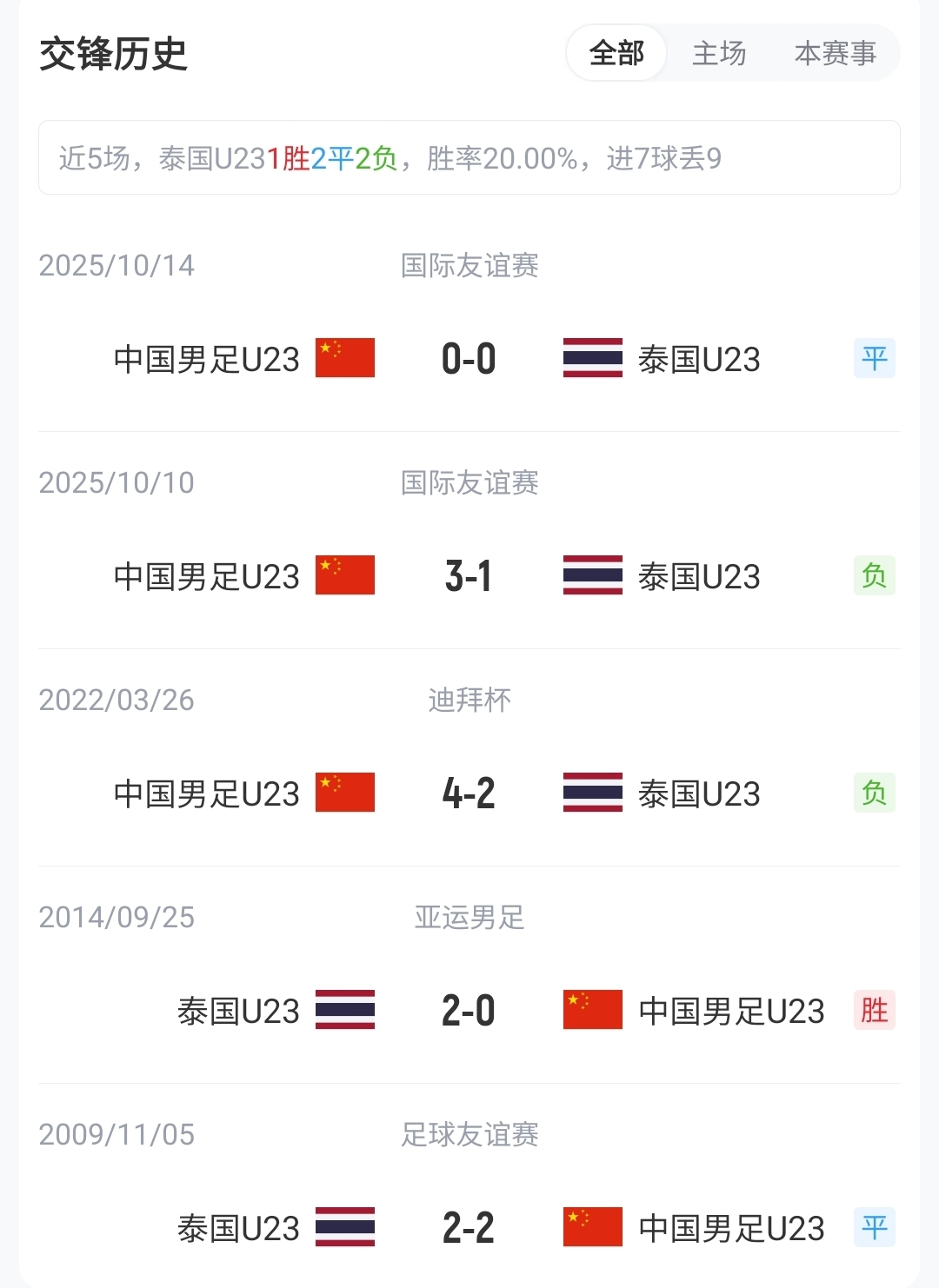 目前D组积分榜上,U23国足1胜1平积4分,位列榜首,本场比赛打平即可出线;泰国U23以1平1负积1分,位列第4。两队曾在去年10月有过两次交手,U23国足1胜1平保持不败。