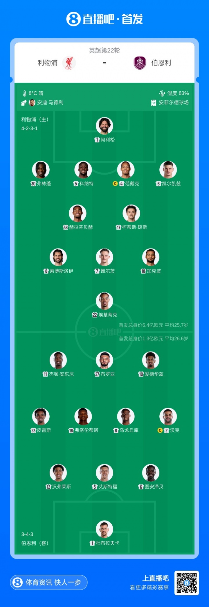 01月17日讯 北京时间23点,英超第22轮,利物浦vs伯恩利,赛前双方首发公布!