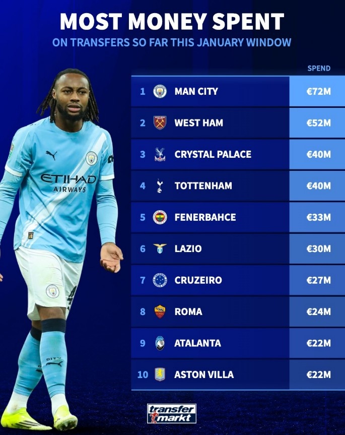 1月19日讯 德转盘点了冬窗至今花费榜单,其中曼城居首,具体如下: