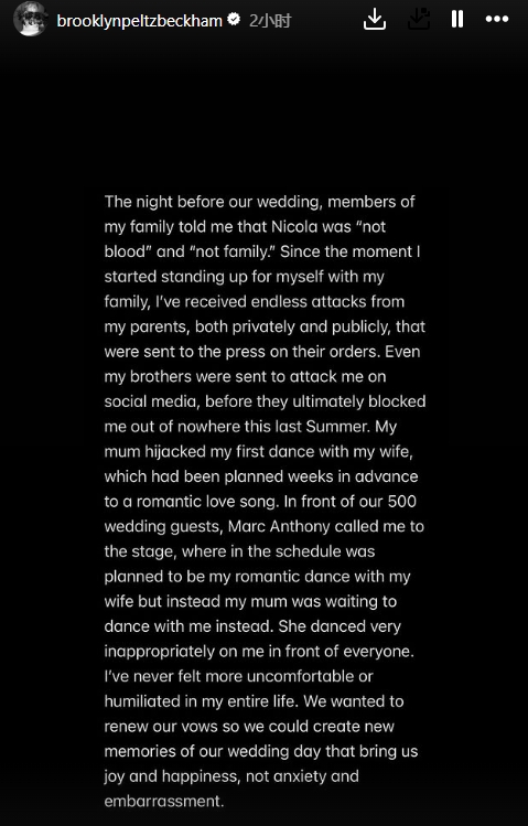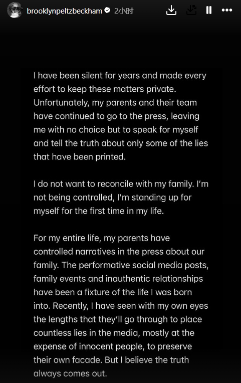 01月20日讯 因婆媳关系不佳,布鲁克林·贝克汉姆与家人关系破裂传闻已久。今天,他在社媒发长文回应,抨击了父母贝克汉姆与维多利亚。