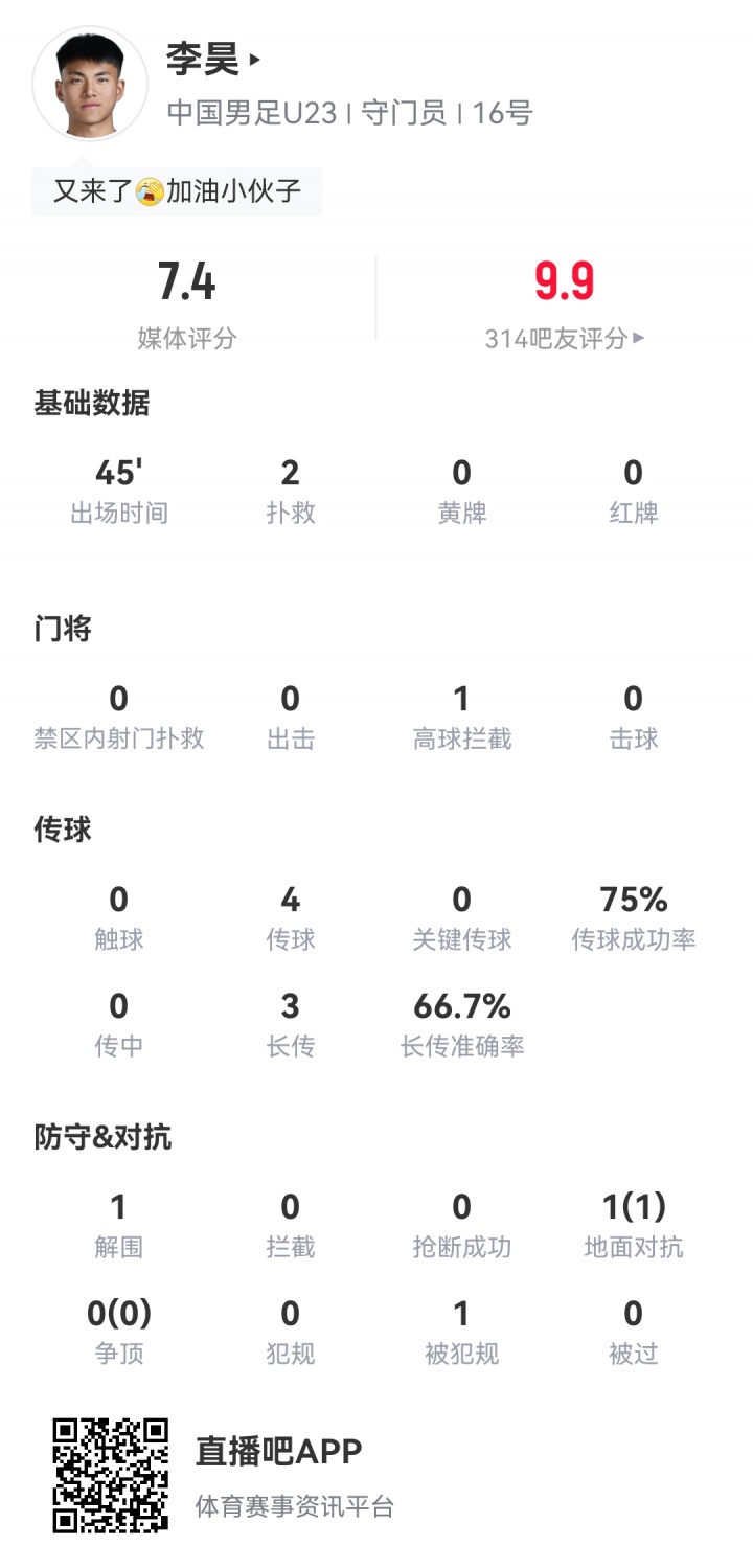 在上半场比赛中,李昊完成2次扑救,他在本届赛事的扑救次数来到26次,在扑救榜上遥遥领先。