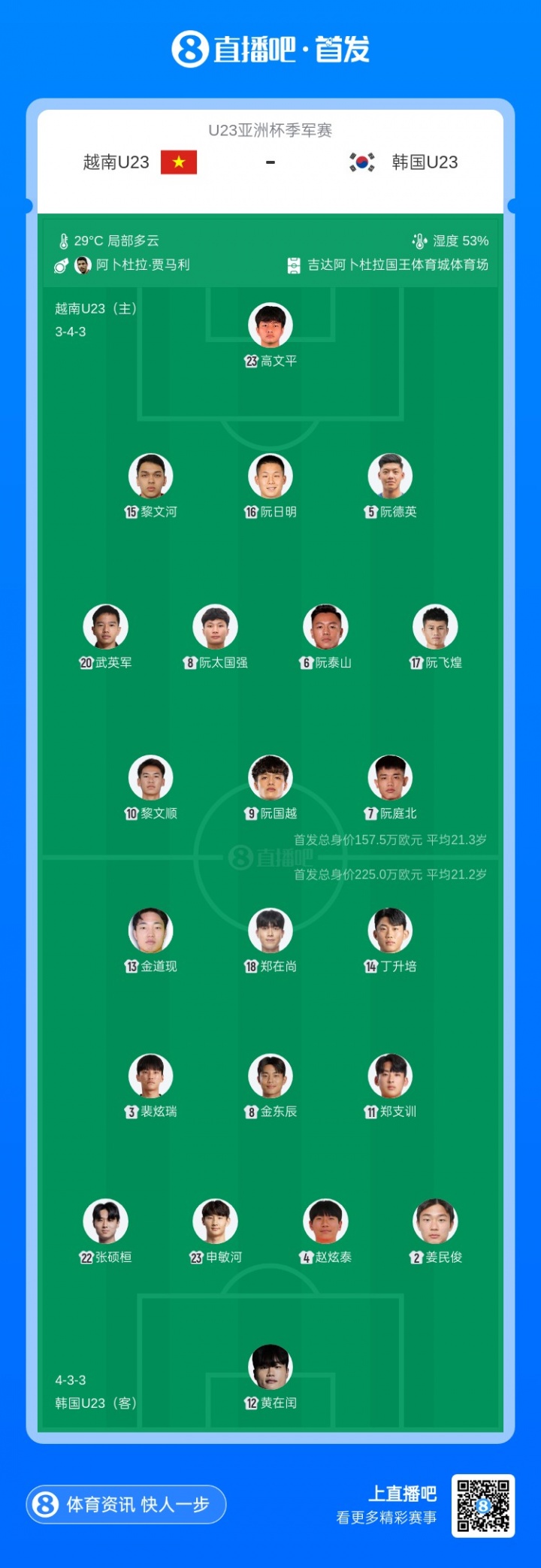 U23亚洲杯季军战!越南vs韩国首发:阮庭北先发,金东辰出战