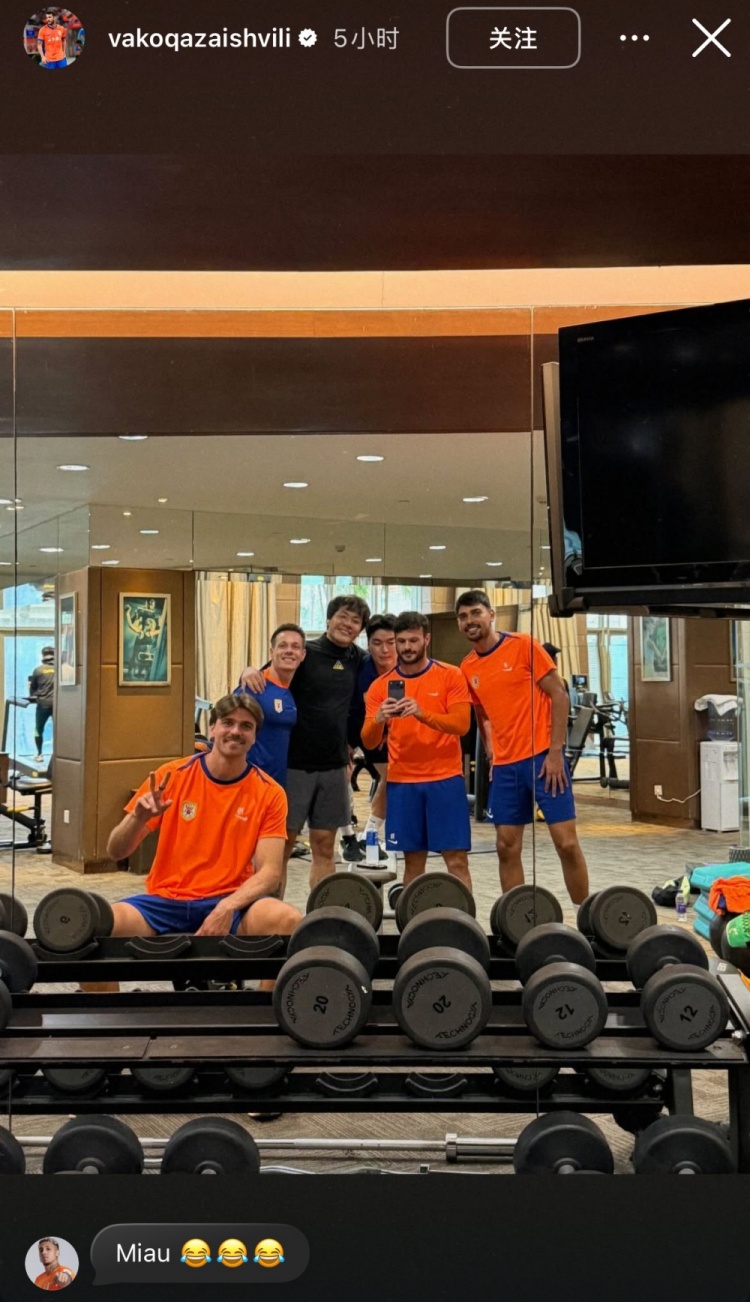 1月23日讯 今日,泰山队外援卡扎伊什维利更新社媒,晒出和队友一同在健身房训练的照片。克雷桑在评论区搞怪评论“喵”。