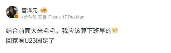 LPL第一赛段WBG战胜JDG,赛后解说管泽元发文:“结合前面大米毛毛,我应该算下班早的,回家看U23国足了。 ”