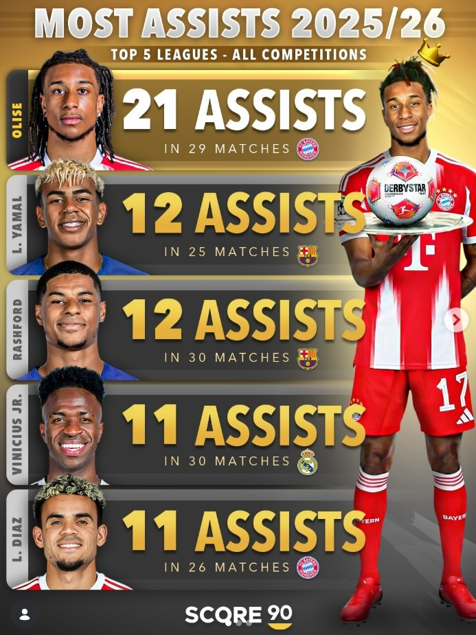 本赛季五大联赛球员助攻榜:奥利塞21助高居榜首,亚马尔次席