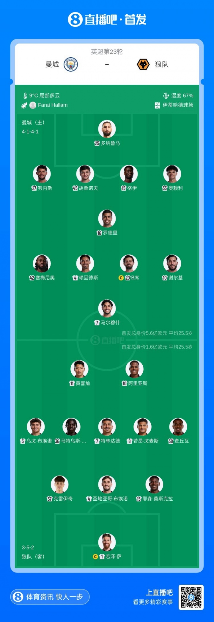 曼城首发:25-多纳鲁马、27-努内斯、45-胡桑诺夫、15-格伊、33-奥赖利、16-罗德里、20-B席、4-赖因德斯、42-塞梅尼奥、10-谢尔基、7-马尔穆什