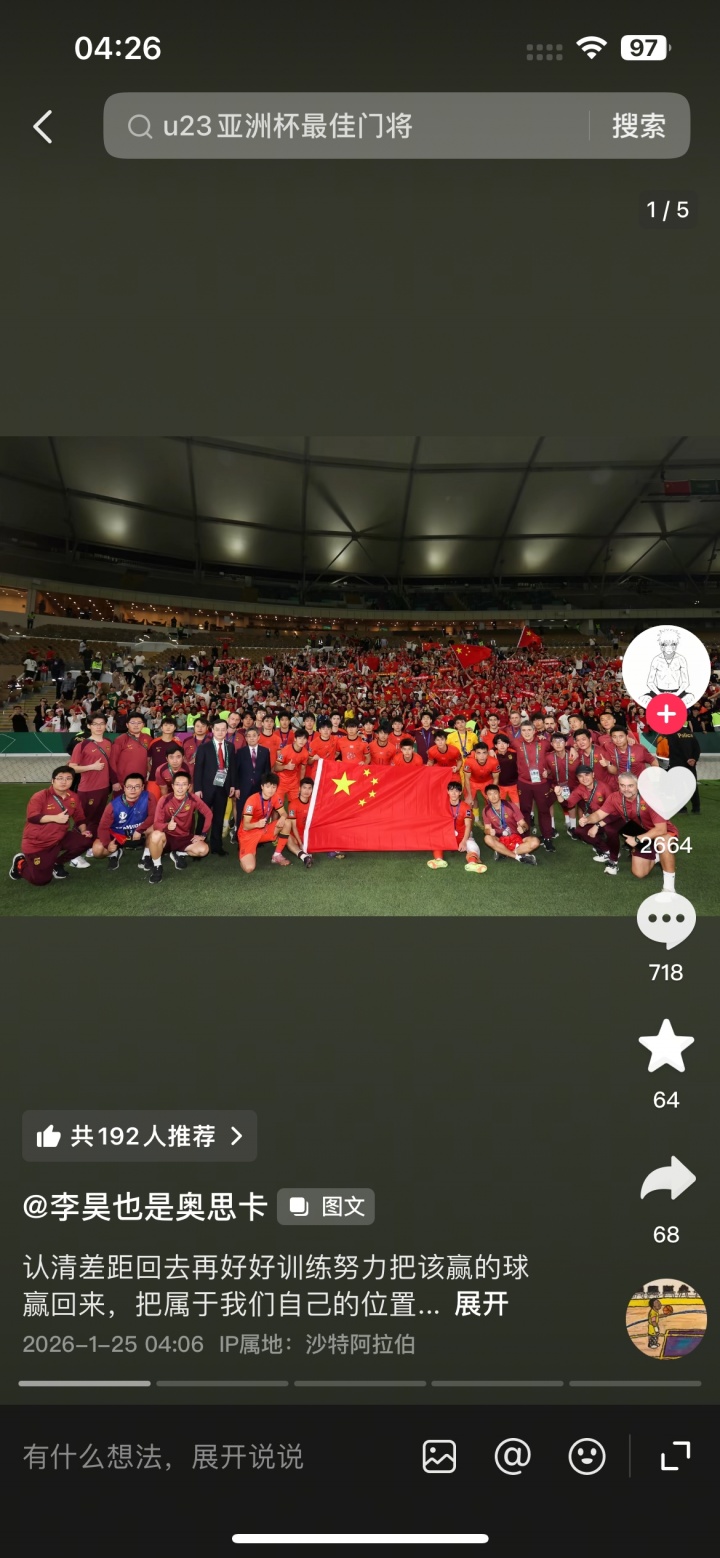 01月25日讯 U23亚洲杯决赛,国足0-4不敌日本无缘冠军,赛后国足U23门将李昊更新社媒。