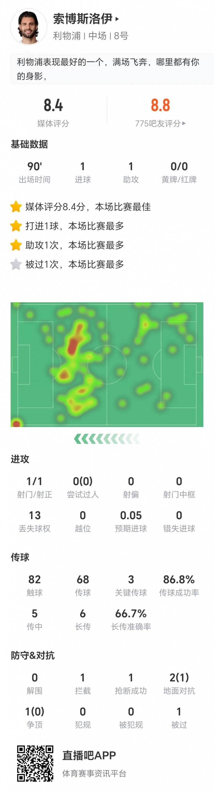 赛后技术统计数据显示,索博斯洛伊本场比赛1射1正,3次关键传球,1次拦截,1次抢断,两次地面对抗成功1次,获评8.4分。