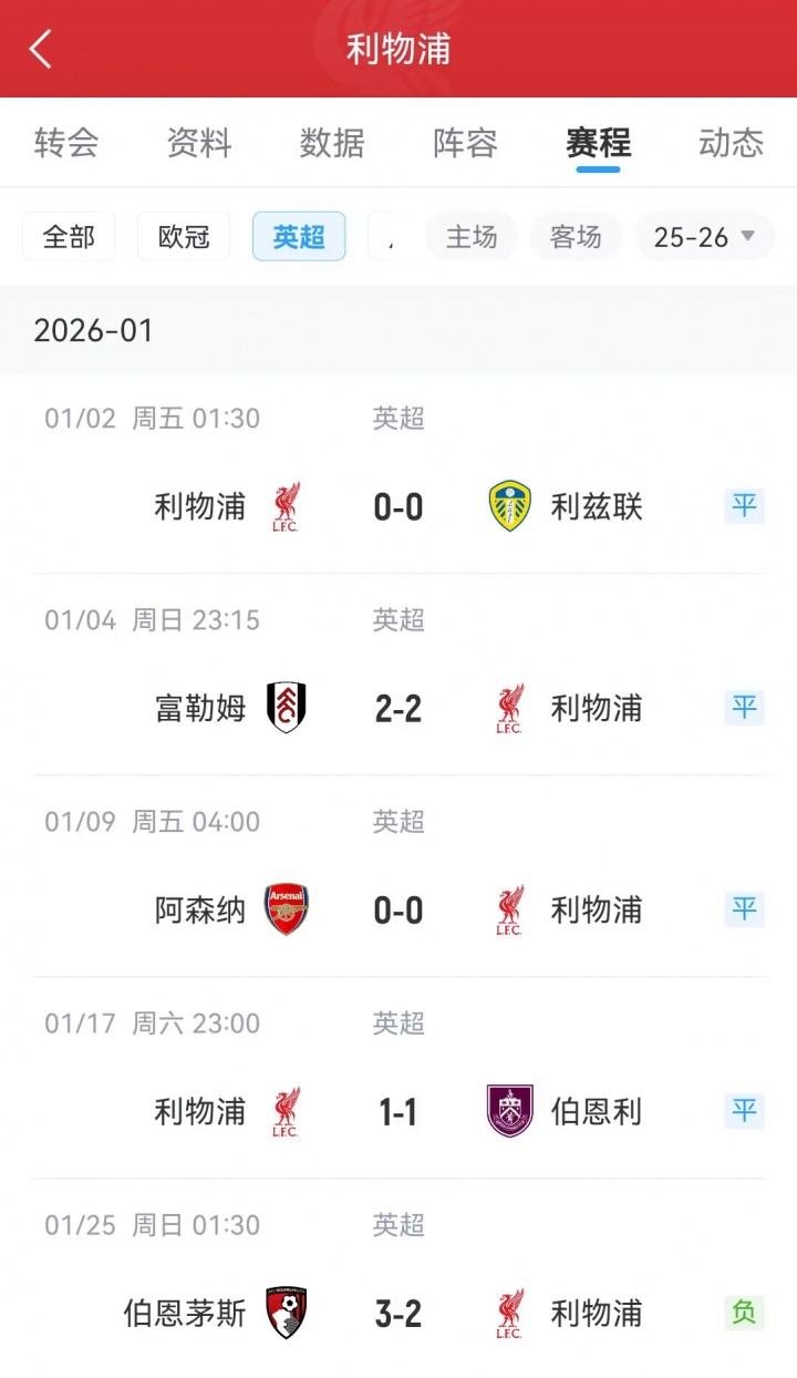 晚些进行的另一场比赛利物浦则是遭伯恩茅斯读秒绝杀,同样遭遇5轮不胜,两支球队一月分别参加的5场英超联赛,总共10场比赛竟无一场胜绩。
