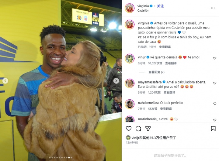 赛后,维尼修斯的女友维吉尼亚在社媒晒出了自己现场观战,并与维尼修斯亲密合影的照片,并配文道:“在回巴西之前,先快速去一趟卡斯特利翁,看我的宝贝踢球并赢球哈哈哈!PS:如果不是为了穿上男朋友的文化衫和球鞋,我甚至不出家门。