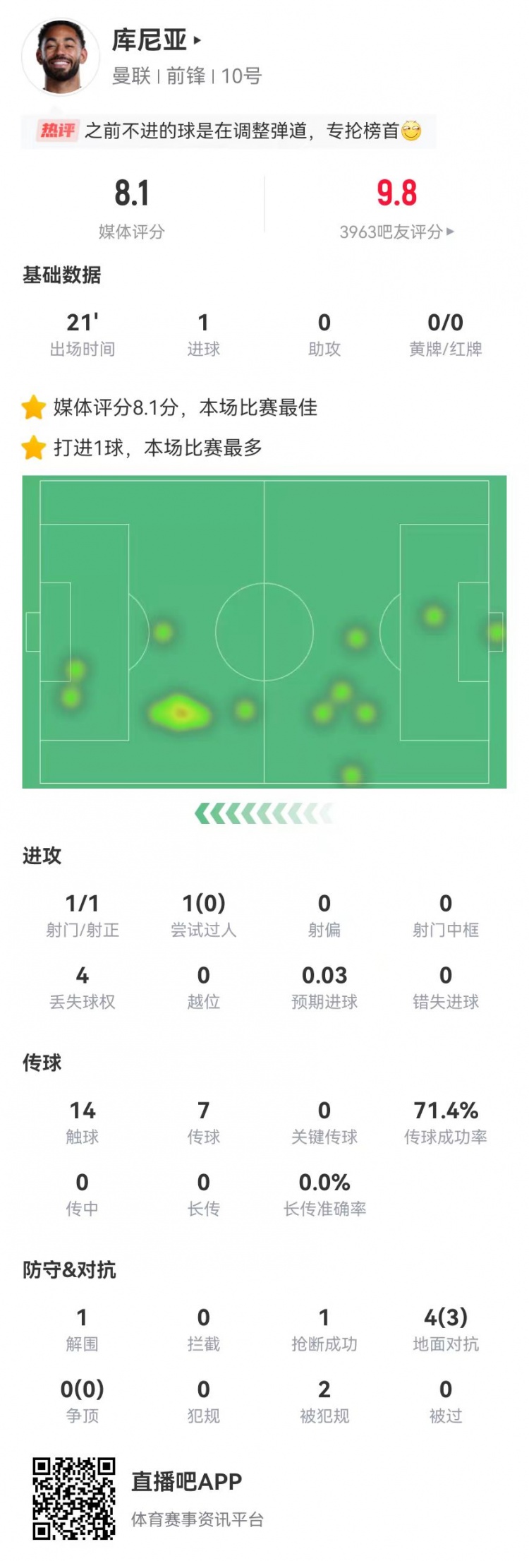 库尼亚替补数据:1射进1球 4对抗3成功+2造犯规 获评8.1分