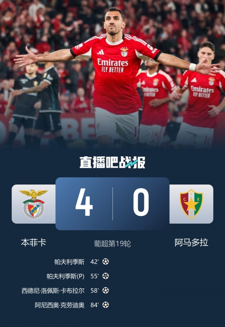 1月26日讯 葡超第19轮,本菲卡坐镇光明球场迎战阿马多拉。上半场第42分钟,卡布拉尔角球助攻帕夫利季斯头槌破门。第52分钟,卡布拉尔突破造点,帕夫利季斯罚进点球。第58分钟,卡布拉尔单刀推射得手。第83分钟,班贾奎传中,阿尼西奥甩头攻门得手。最终,本菲卡4-0阿马多拉。积分榜方面,本菲卡以45分仍然排在第3位,阿马多拉积19分排在第13位,仅领先降级附加赛区域2分。