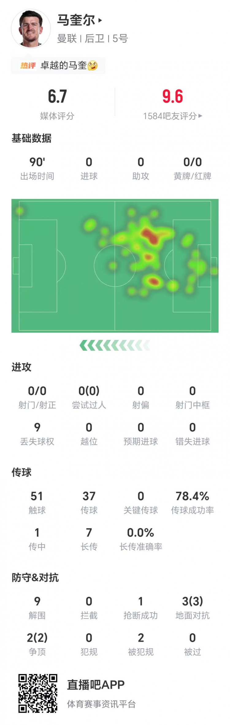 马奎尔数据:9次解围,3次地面对抗、2次争顶均成功,获评6.7分