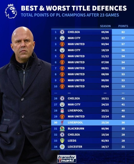 在英超历史上,本赛季的利物浦位居最糟糕的卫冕冠军之列,红军在23轮之后的积分仅仅高于1995-96赛季的布莱克本(35分)、2015-16赛季的切尔西(28分)、1992-93赛季的利兹联(28分)以及2016-17赛季的莱斯特城(21分)。