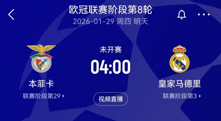 01月28日讯 明天凌晨4点,欧冠联赛阶段末轮18场比赛同时打响。其中最具话题性的一场当属本菲卡vs皇马。