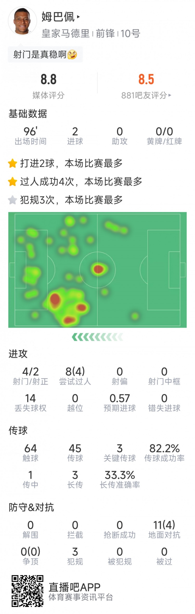 姆巴佩本场数据:梅开二度,4射2正,4次过人,3次关键传球