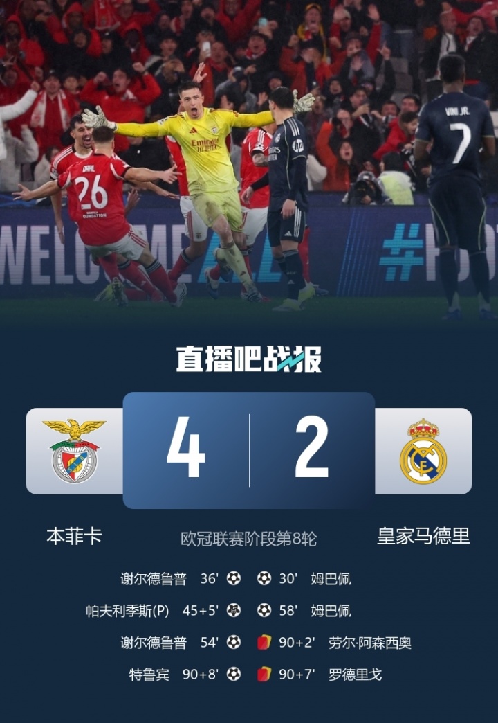 01月29日讯 欧冠联赛阶段第8轮已经全部结束,皇马2-4不敌本菲卡,最后一轮掉出前8,而本菲卡也是凭借门将特鲁宾的绝杀压哨晋级附加赛!