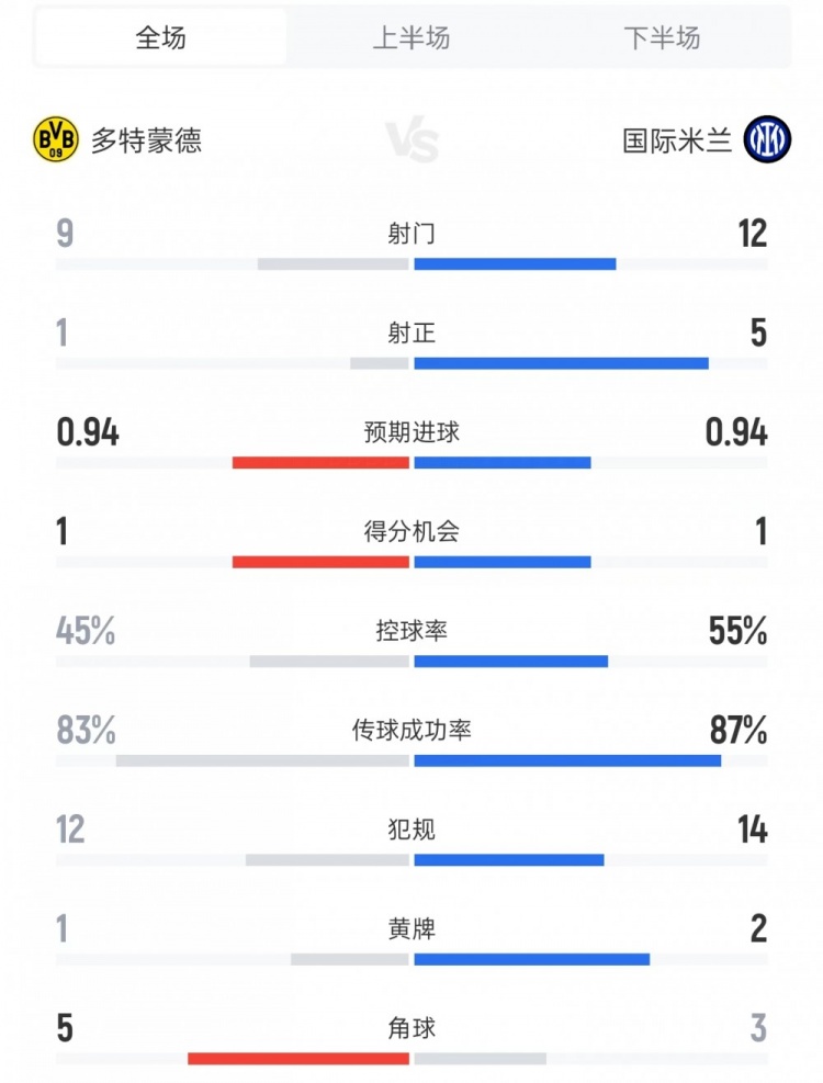 多特vs国米全场数据:射门9比12、射正1比5、控球率45%比55%