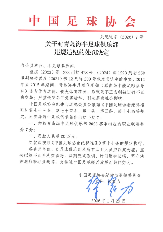 一、扣除青岛海牛足球俱乐部2026赛季相应的职业联赛积分7分;