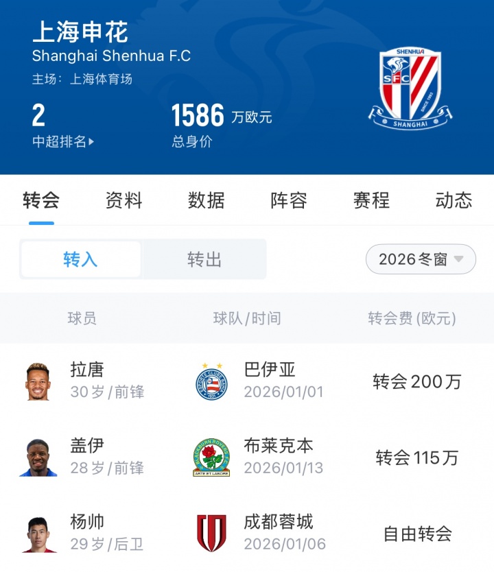 此次冬季转会窗,申花是最为活跃的中超球队之一,他们先后签下了J联赛银靴拉唐、蓉城中卫杨帅以及英冠前锋盖伊,并且续约了吴曦、朱辰杰、李可、特谢拉、马纳法五名大将。