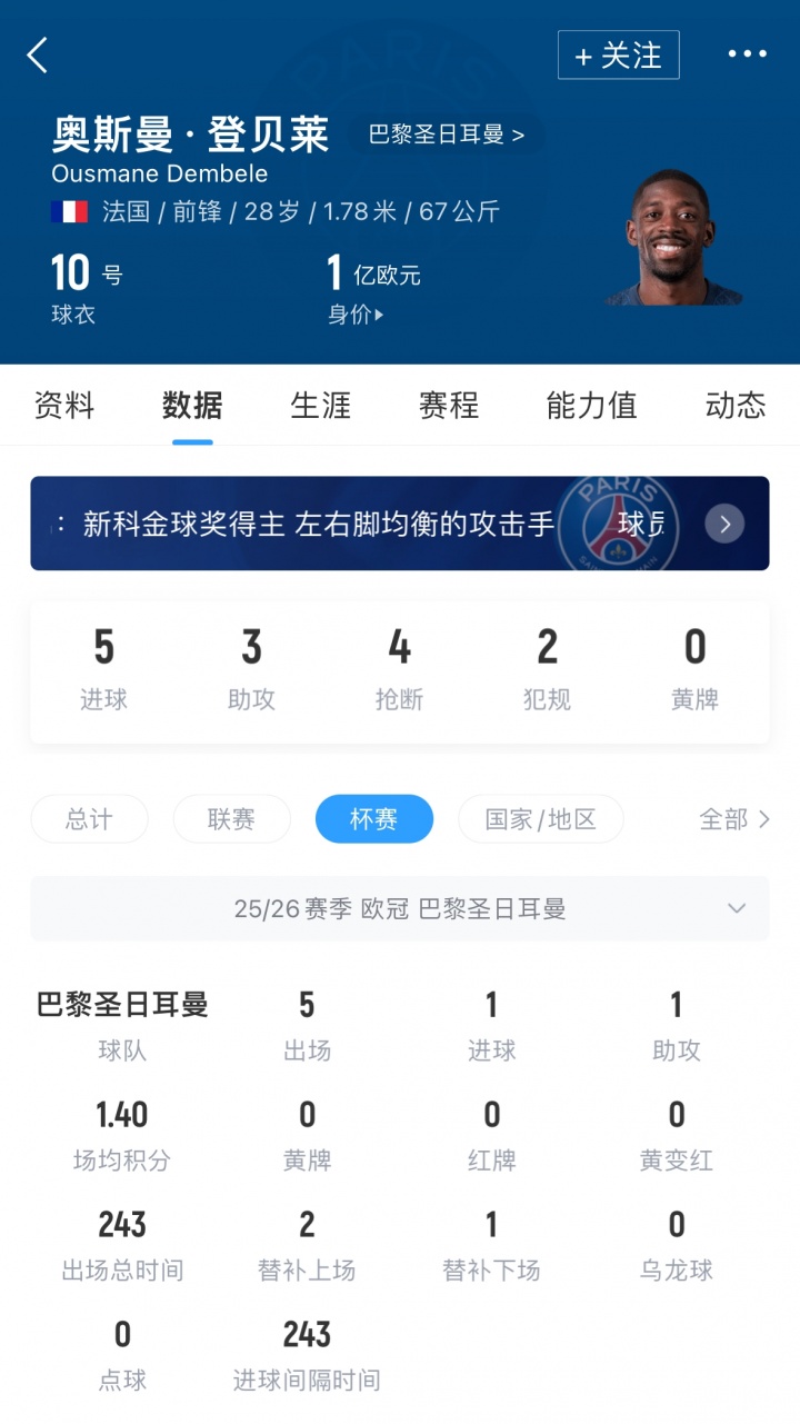 上个赛季,登贝莱凭借优异表现成功拿下去年的金球奖,他49场比赛贡献夸张的33球15助,率队拿下五冠王,其中欧冠15场贡献8球6助。