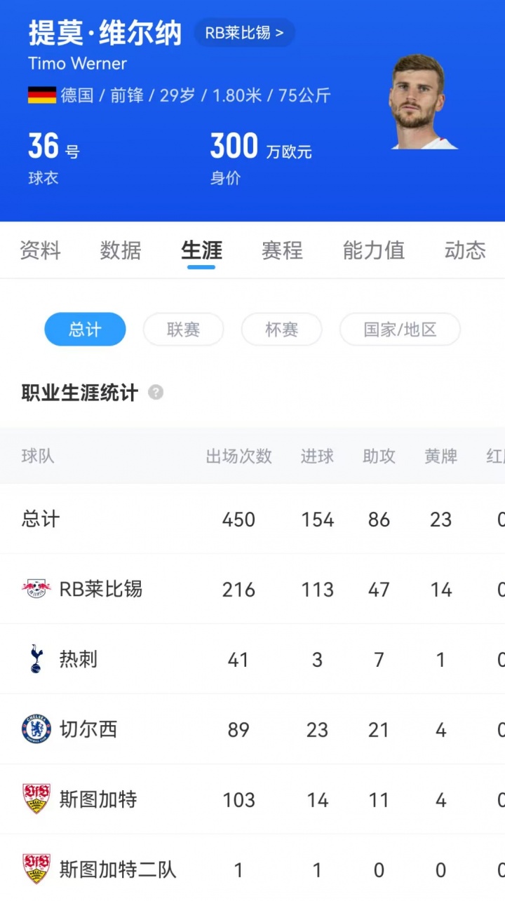 现年29岁的维尔纳生涯曾效力莱比锡、热刺、切尔西、斯图加特等球队,本赛季他为莱比锡只出场3次没有进球或助攻。目前他的德转身价已经降至300万欧元,他在2020年曾达到个人巅峰身价8000万欧元。