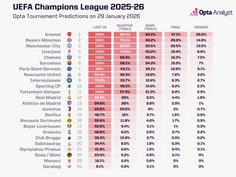 1月30日讯 欧冠联赛阶段已经结束了全部争夺,除了已经被淘汰的8支球队外,OPTA对剩余球队的夺冠概率进行了预测,阿森纳以29.8%居首,拜仁以14.9%位居次席。