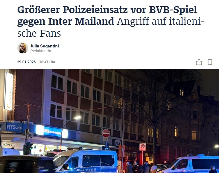 1月30日讯 据德国媒体报道,在多特主场对阵国米的欧冠比赛前夕,当地发生了一起针对意大利球迷的恶性袭击事件,导致警方展开大规模行动。