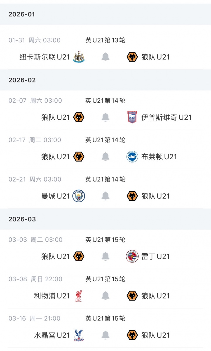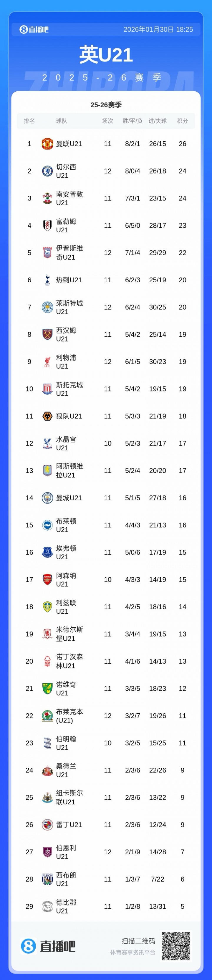 徐彬加盟的狼队U21什么水平?现排积分榜第11 联赛共29队曼联领跑