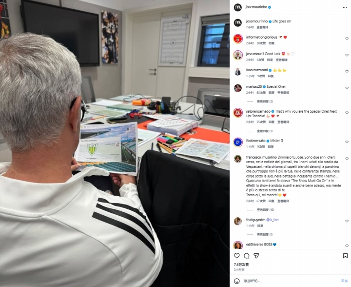 图中穆里尼奥正在看对手通德拉的资料,穆帅配文写道:生活还在继续。
